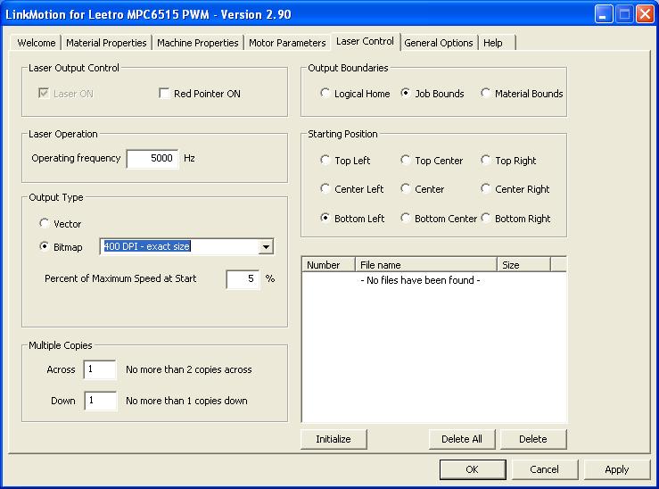 - Extremely convenient positioning of the job with respect to the design area in a program like Corel Draw and the working area of the laser machine. The output boundaries can be defined as Logical Home, Job Bounds, or Material Bounds.