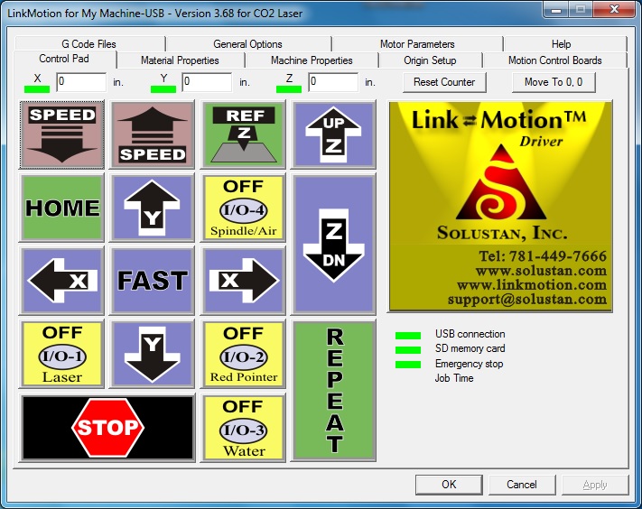 The numeric keypad of the PC keyboard is used as a Control Pad to jog the axis of the laser machine, position the laser beam, issue home command, repeat a job, decrease or increase the processing speed while the job is in process, pause and either quit or continue the job after pausing, check out the I/O’s, and other functions.