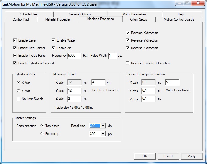 - Easy to customize configuration file for your machine including microstep resolution per millimeter for all 4 axis (X, Y, Z, and cylindrical axis), total working area, PWM laser frequency, and other settings.