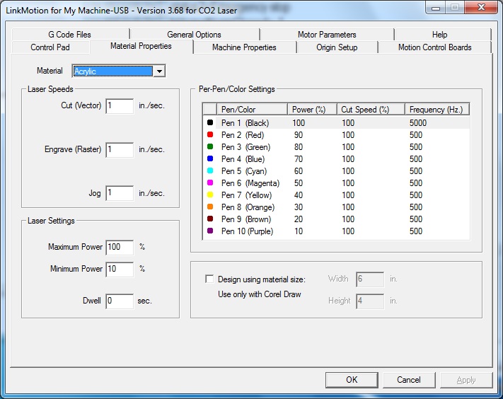 LinkMotion USB picks up appropriate Engrave (Raster) and Cut (Vector) information from the application when the job is printed to the driver. With the preset information for acceleration, resolution in each of the axis, color based settings for power, speed, and frequency, and process speeds, LinkMotion prepares and processes the job.